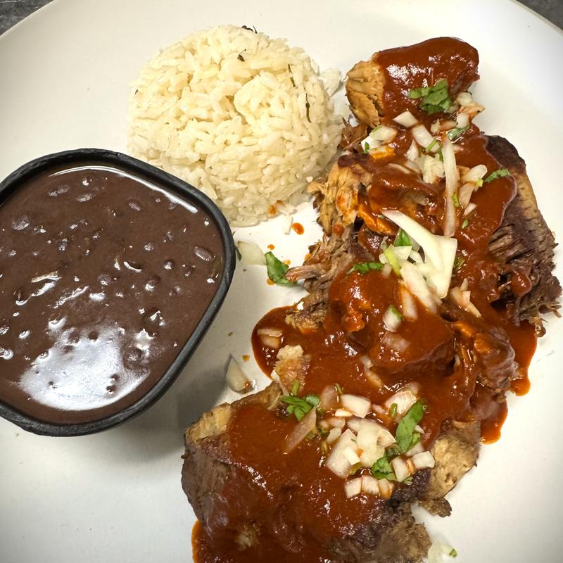 braised beef birria, slow roasted Yucatan-style cochinita pibil, sous vide pueblo chicken mole, Mexico City flavor chicken tinga served with side of mint rice, black beans, guacamole, onions & cilantro, pickled onions, birria consommé