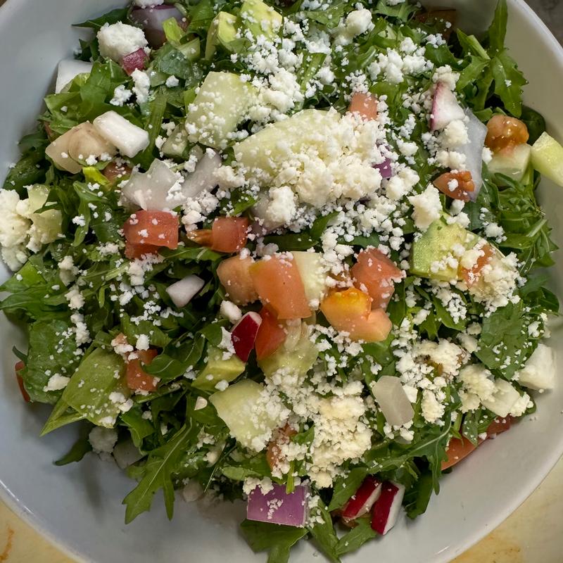 chopped romaine & arugula mixed, tomatoes, cucumbers, red onions, radishes, avocado, queso fresco, lemon vinaigrette dressing